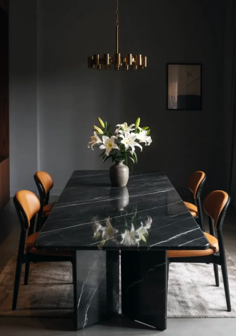 Chairs in soft leather or velvet complement the polished look without competing for attention. Gentle lighting helps highlight the stone surface and adds warmth to the overall setting. This combination creates a dining space that feels elegant and ideal for hosting formal meals or special gatherings.