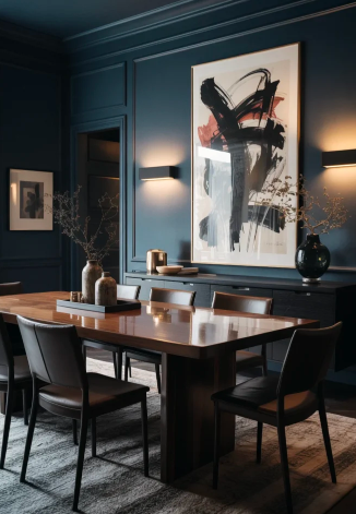 Deep blue shades like navy or midnight blue bring strong character to a Bold Moody Dining Room. These colors provide depth while remaining versatile enough to suit both traditional and modern interiors.