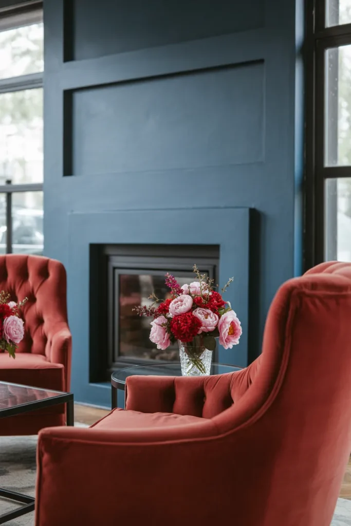 Slate blue offers a sophisticated contrast to red. I’ve painted fireplace walls in slate blue and added red velvet seating to create a dramatic yet modern focal point in living rooms. Pink or red floral accents tie the colors together.