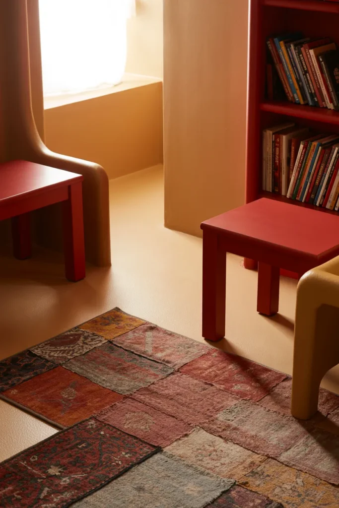 Ecru provides a cozy, inviting background for red accents. I use patchwork rugs in faded reds with brighter red furniture pieces to guide the eye through small spaces. Warm tones unify the design naturally.