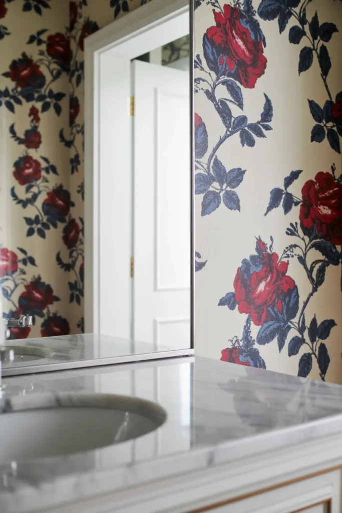 Pro Tip: I include small red accessories in bathrooms or living areas to echo the wallpaper colors.
