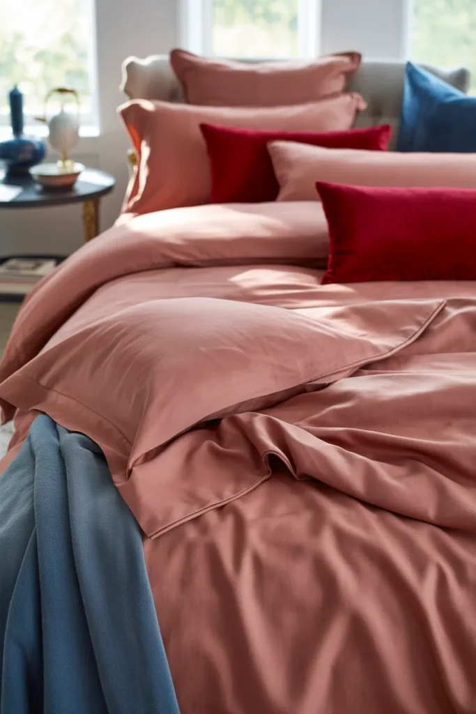 Dusty rose softens red’s intensity without dulling its energy. I use this combination in bedrooms to create warmth that feels inviting rather than overwhelming. Red pillows with dusty rose bedding make a room restful yet stylish.