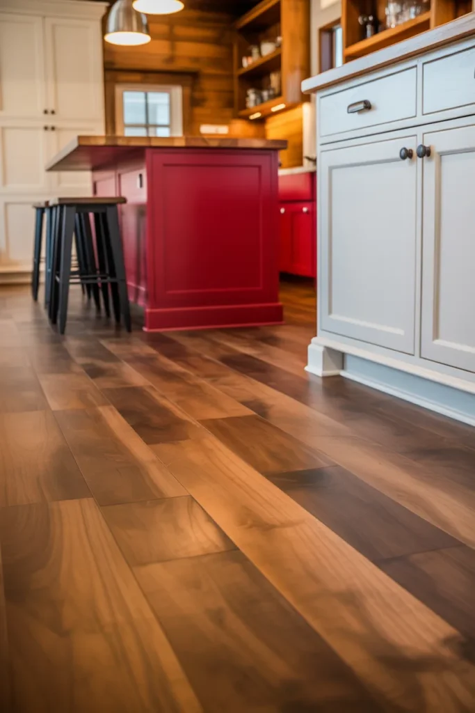 Natural wood tones offer a grounding, neutral base for red. I pair dark wood floors with white cabinetry and red kitchen islands for an organic, welcoming look. Wall paneling adds texture and depth.