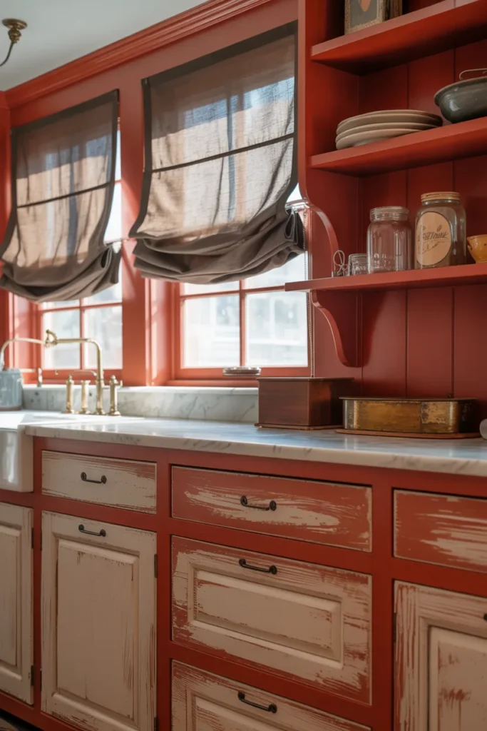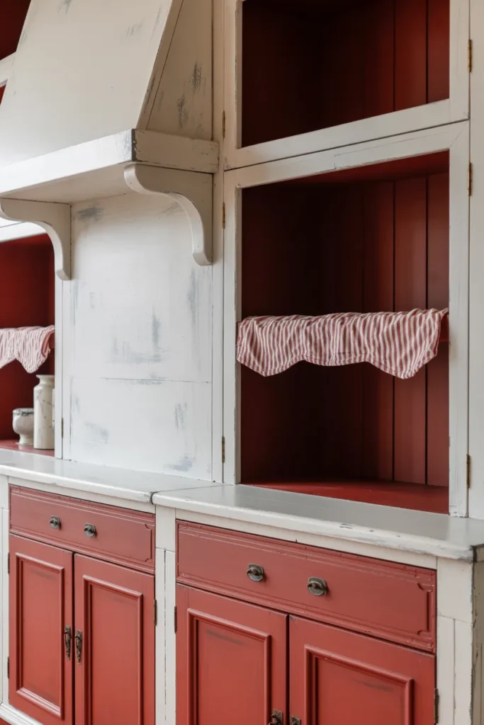 Weathered white brings vintage charm with red accents. I often combine bright red lower cabinets and dark maroon upper cabinets against weathered white walls for a balanced, layered look. Striped furniture accents amplify the aesthetic.