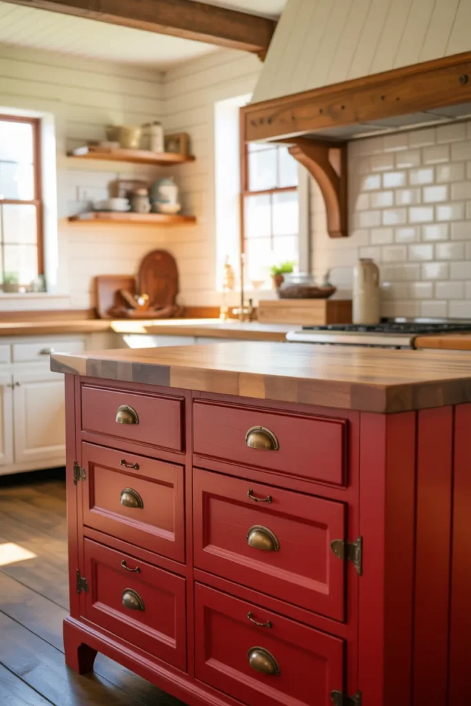 Creamy white softens the intensity of red for rustic or farmhouse settings. I often pair a red kitchen island with creamy white walls to create a warm, inviting atmosphere. Dark floors recede, keeping focus on the red elements.