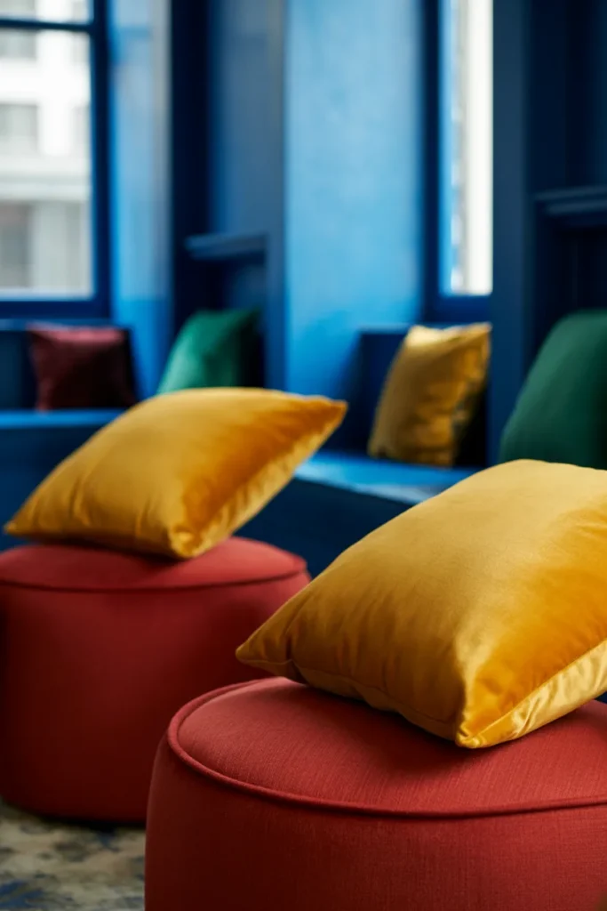 Golden yellow warms up red spaces and brings natural harmony. I’ve combined red ottomans with golden yellow pillows and touches of blue walls for a jewel-toned, balanced look.