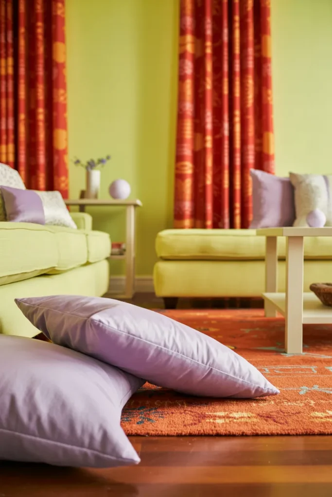 I’ve noticed pastel yellow adds cheerful energy when paired with red. I often combine red-orange patterns on textiles with pale yellow walls to brighten rooms while keeping the look lively. Lavender or neutral accents enhance the overall harmony.