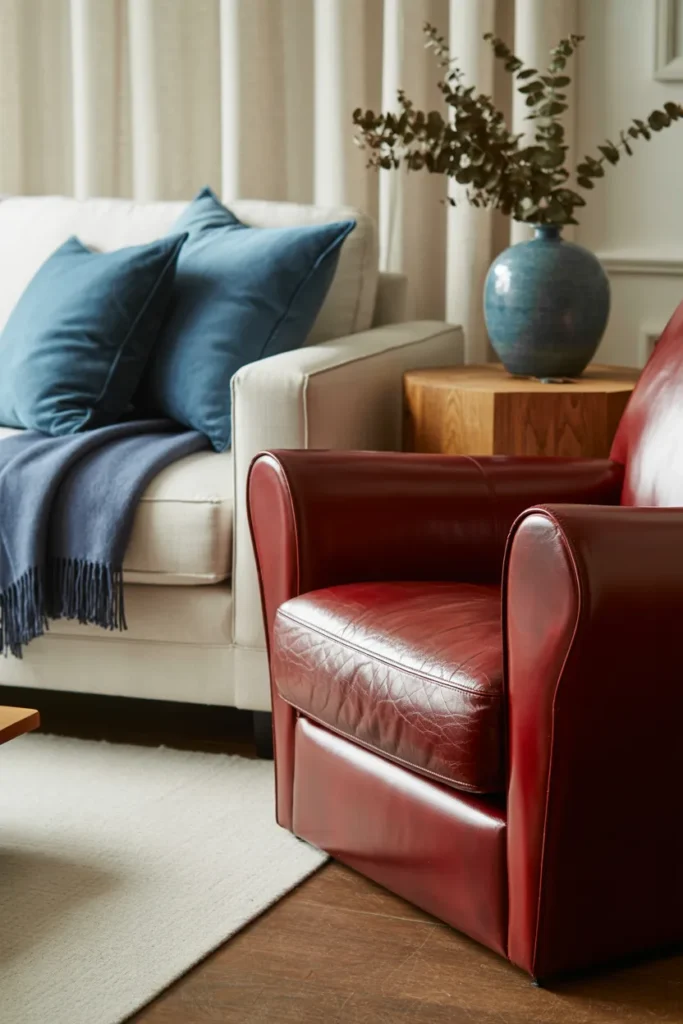I’ve found navy blue and red create a timeless, harmonious palette. The deep blue grounds the vibrancy of red, making it perfect for bedrooms or traditional living rooms. I use navy bedding or upholstery with red accents to maintain balance.