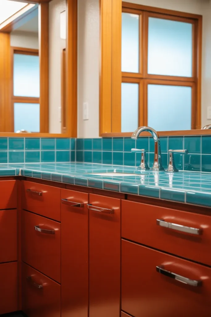 Turquoise brings a playful, fresh vibe when paired with red. I’ve experimented with turquoise accents in bathrooms alongside red cabinetry to create a modern, coastal look. Mirrors and light wood elements complete the effect.