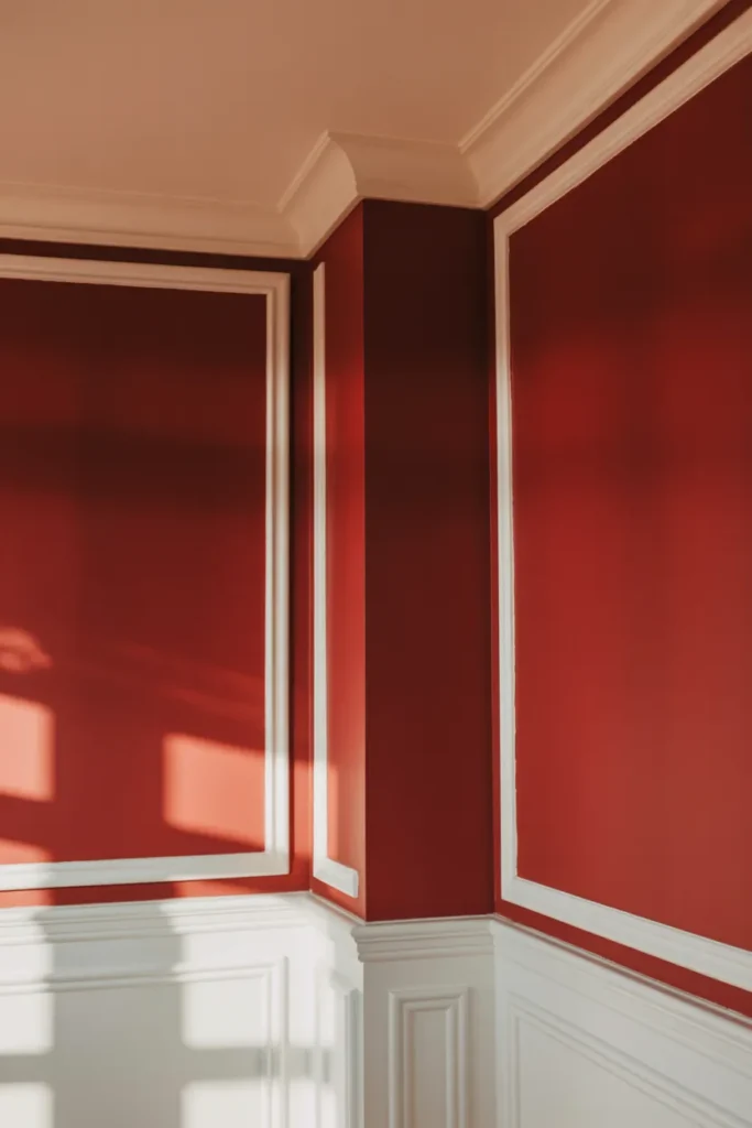 When I want red to be the main focus, I rely on pure white. This combination makes red pop naturally while keeping the space bright and airy. I often use white moldings or trim alongside red walls to create a clean, elegant look.
