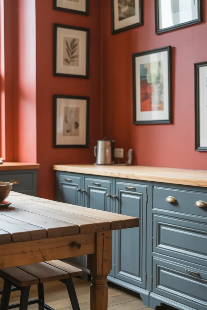 Stormy gray adds depth when paired with red. I use this combination in kitchens with red walls and gray cabinets, creating an inviting and functional space. Black-framed artwork adds a soft contemporary element.