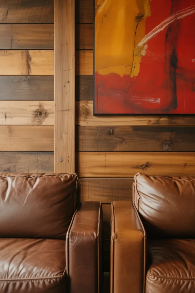 Red and spice orange create a natural, warm palette. I’ve combined plank wood walls with red and orange artwork for contemporary, nature-inspired spaces. Chocolate brown furnishings anchor the palette.