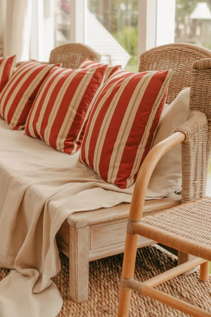 Natural fibers like sisal give red accents a cozy foundation. I use red-striped pillows on rattan chairs or woven furnishings to create a cottage-style feel. The neutral textures allow red to remain prominent without overpowering the room.