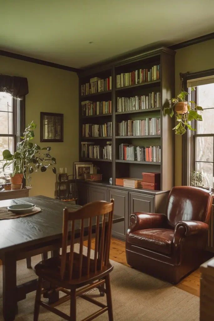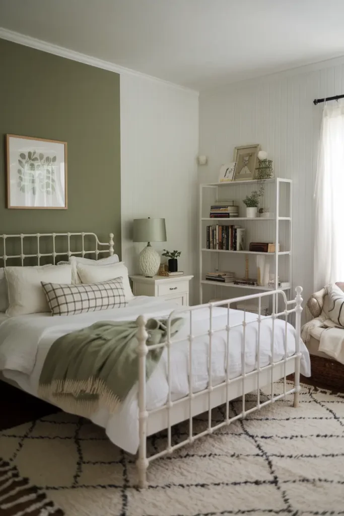 I love pairing sage green with white because it creates a bright and timeless look that instantly makes a room feel fresh and open. White trims, wall paneling, or bedding can highlight the softness of sage green walls while keeping the space light and airy. This pairing works especially well in bedrooms, kitchens, and bathrooms where a clean and peaceful atmosphere is important.
