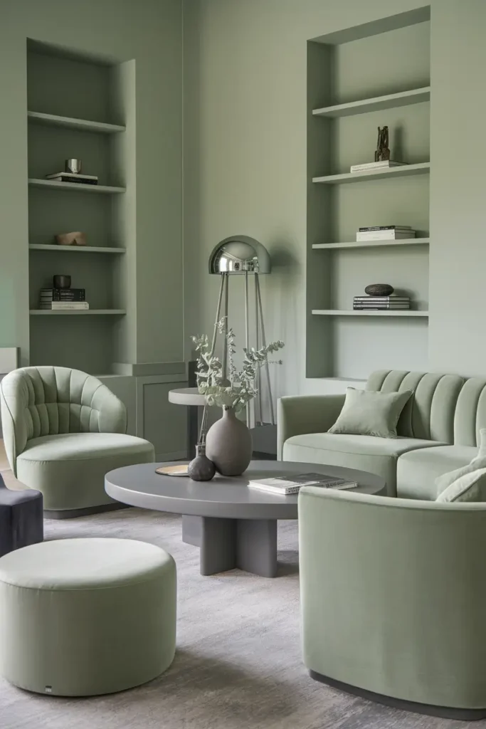 I like using gray with sage green to achieve a modern and polished interior style. Light gray tones balance the softness of sage, while darker gray shades add depth and contrast. This combination works well in living rooms or kitchens, especially when paired with sleek finishes or subtle metallic accents.