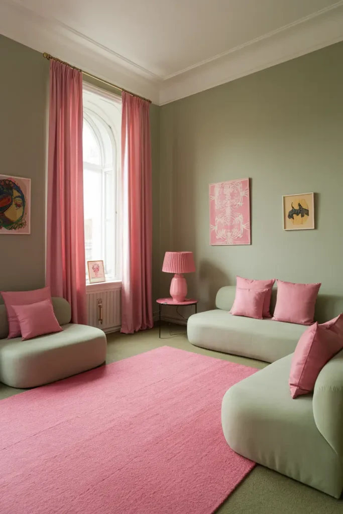 Dusty pink and sage green create a charming and slightly playful look that still feels calm and balanced. I often suggest using pink pillows, artwork, or accent walls alongside sage furniture to add a soft pop of color. Gold or brass decor pieces can enhance the overall elegance of this color pairing.