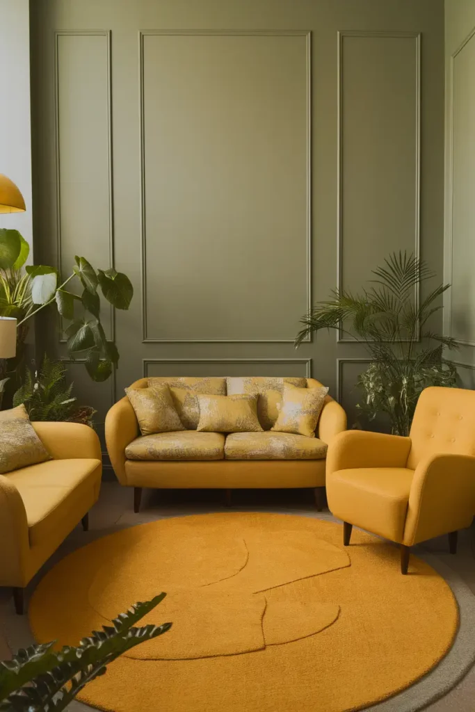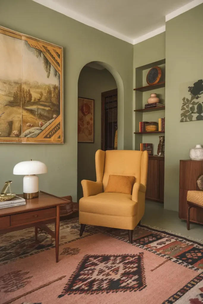 Mustard yellow and sage green create a bold and stylish contrast that adds personality to a space. I often recommend mustard pillows, blankets, or accent chairs against sage walls to introduce warmth and depth. This combination fits perfectly in bohemian, eclectic, or mid-century inspired interiors.