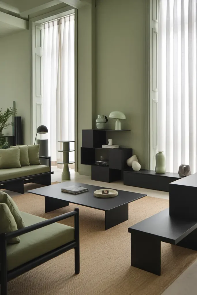 Black accents paired with sage green instantly add structure and a modern touch to the space. I like incorporating matte black fixtures, frames, or lighting against sage backgrounds to create a striking contrast. This combination is particularly effective in contemporary or minimalist interiors.