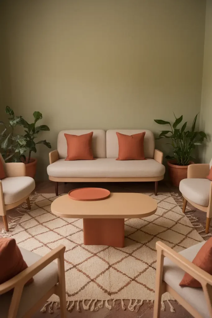 Terracotta shades add warmth and earthy richness when paired with sage green decor. I often use terracotta planters, rugs, or cushions to introduce rustic character into the space. This pairing fits perfectly in Mediterranean or bohemian interiors where natural colors and textures stand out.