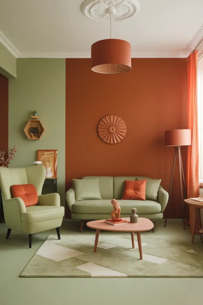 Orange accents bring energy and creativity to a sage green palette without overpowering the room. Burnt orange or soft tangerine tones can be used in blankets, artwork, or statement furniture pieces. I like this combination for creative areas such as studios or vibrant living spaces.