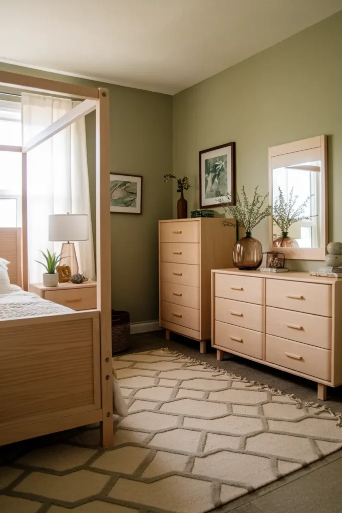 Wood tones naturally enhance sage green because both elements reflect nature’s calm beauty. Light woods create a fresh and airy look, while darker woods add richness and depth to the design. Wooden furniture, shelves, flooring, or small decor pieces can beautifully highlight sage green interiors.