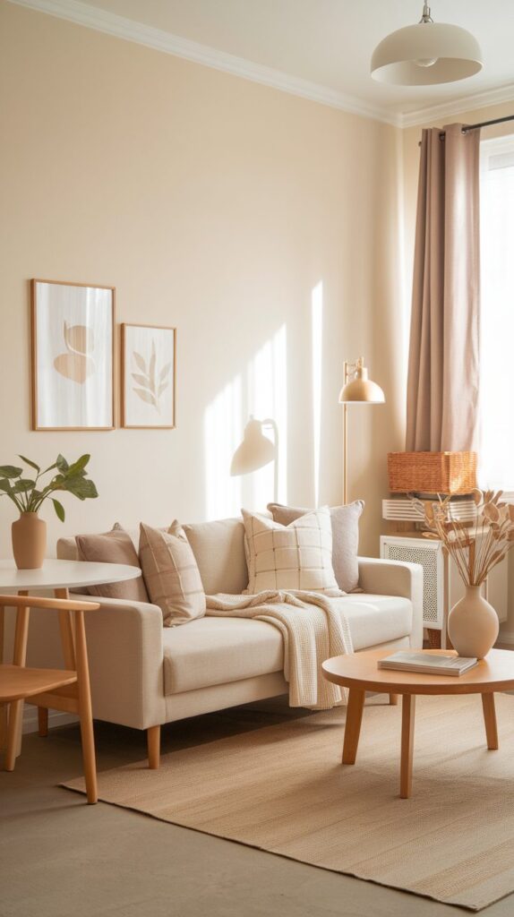 Starting with warm neutral tones creates a soft and inviting foundation for small-space living. Shades like beige, creamy white, taupe, and gentle greige make a studio feel airy while still maintaining warmth. Cooler whites can sometimes feel sterile, but warmer tones instantly add comfort and make the apartment feel more livable. Keeping a consistent neutral base also reduces visual distractions and allows furniture and decor to blend seamlessly. Once you establish one main warm shade, you can gradually layer similar tones to build depth. Many Cozy Studio Apartment Ideas begin with this simple color strategy because it visually expands the space while keeping it comfortable and cohesive.