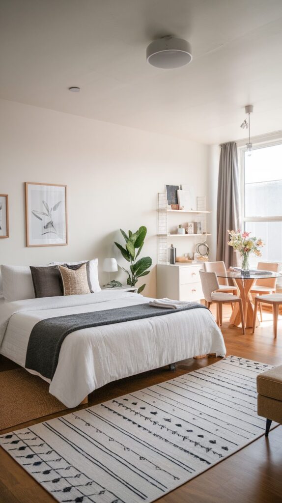 You can define zones using rugs, furniture placement, lighting changes, or open shelving. For example, placing a rug under the bed area and another under the living space helps visually divide the room. These Cozy Studio Apartment Ideas allow you to create clear sections while keeping the layout open and bright.