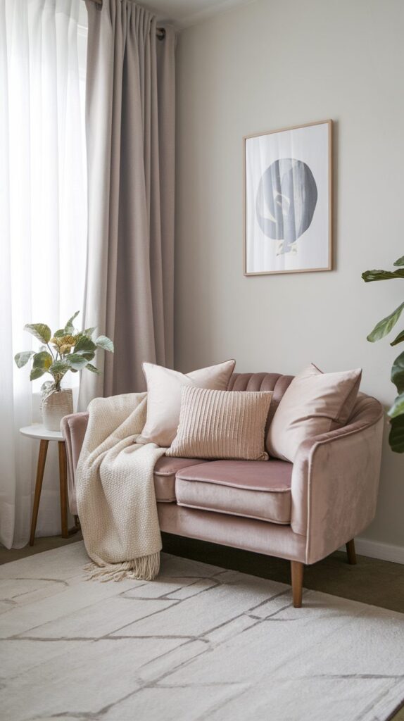 The sofa often becomes the central feature of a studio apartment, so selecting the right size and design matters greatly. Compact loveseats or slim sectionals with built-in storage offer comfort without overwhelming the room. Oversized furniture can quickly make a small space feel restricted and heavy. Choosing a scaled-down piece keeps the layout breathable and functional. Soft fabrics like boucle, velvet, or plush upholstery add texture and warmth without requiring extra decor. Smart sofa choices are key elements in Cozy Studio Apartment Ideas because they combine comfort, scale, and practicality in one essential piece.