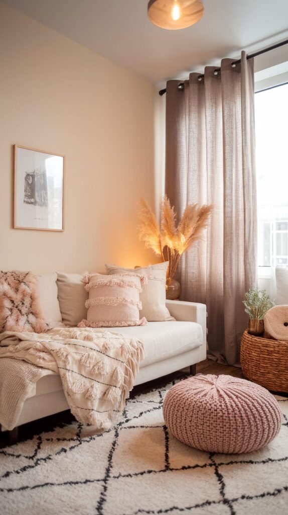 Textiles are one of the easiest ways to introduce warmth into a studio. Throws, pillows, rugs, and curtains soften sharp edges and create visual comfort. Instead of overwhelming the room with bold patterns, layering different textures keeps the design interesting while maintaining balance. Chunky knit blankets, plush area rugs, and light linen curtains all contribute to a cozy atmosphere. These elements require little space yet deliver significant impact. Many Cozy Studio Apartment Ideas rely on textile layering because it enhances comfort without adding clutter or bulk.