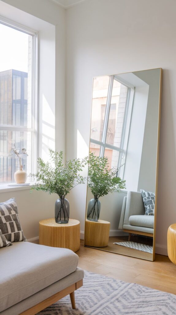 Mirrors naturally reflect light, making small apartments feel brighter and more open. Positioning a mirror across from a window helps distribute natural light throughout the room. Even a simple full-length mirror leaning against a wall can add depth and style. Mirrors visually expand tight areas without taking up physical space. Among effective Cozy Studio Apartment Ideas, this approach works especially well because it enhances both brightness and perceived size without altering the layout.