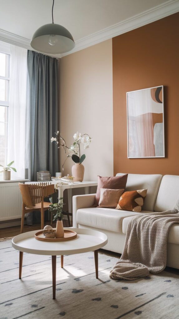 Warm neutrals such as beige, soft white, taupe, and light greige work beautifully in studio apartments. These shades create a calm base and make the space feel open while still comfortable. You can then add subtle accent colors through pillows, artwork, or decor to maintain balance.