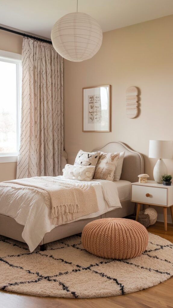 Neutral shades like beige, soft green, and gentle brown make the room cozy yet fresh. The overall effect feels soothing rather than busy.