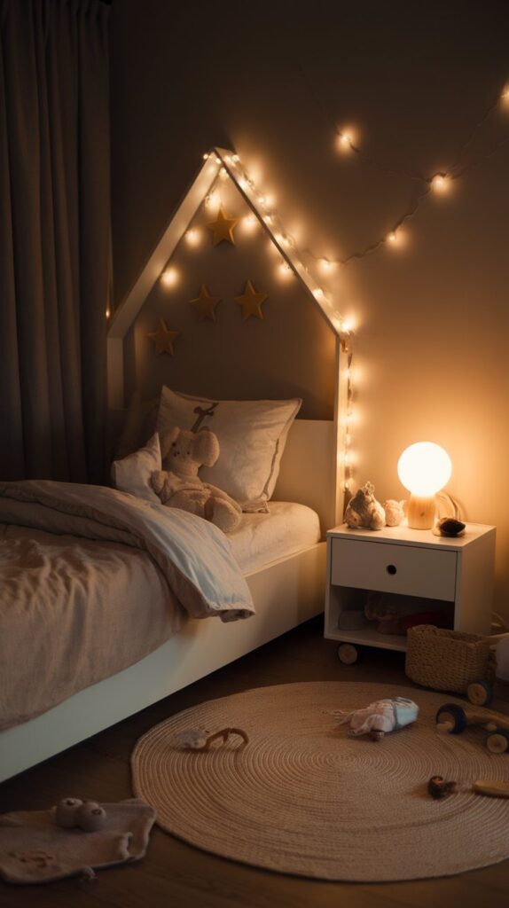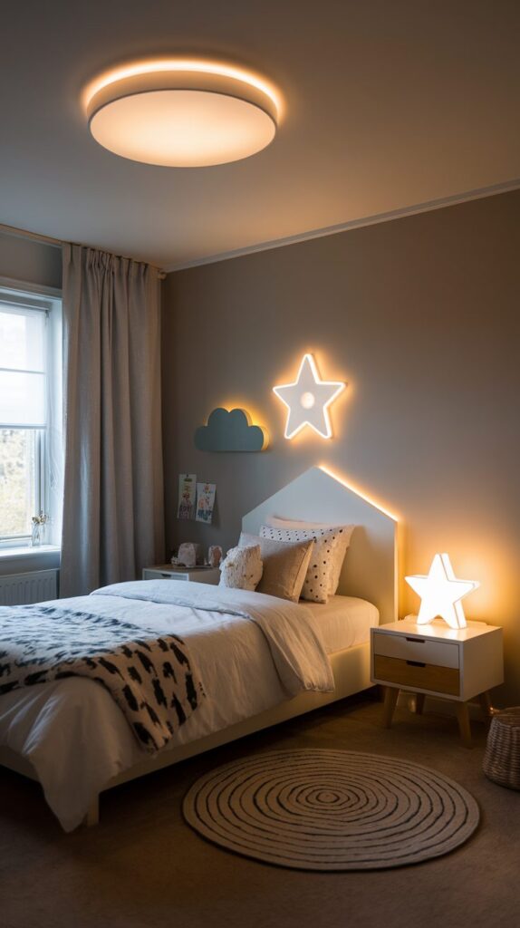 Layered lighting works best. Combine a soft ceiling light, a warm bedside lamp, and a gentle night light. Warm-toned bulbs help children relax at night, while proper desk lighting supports reading and homework during the day.