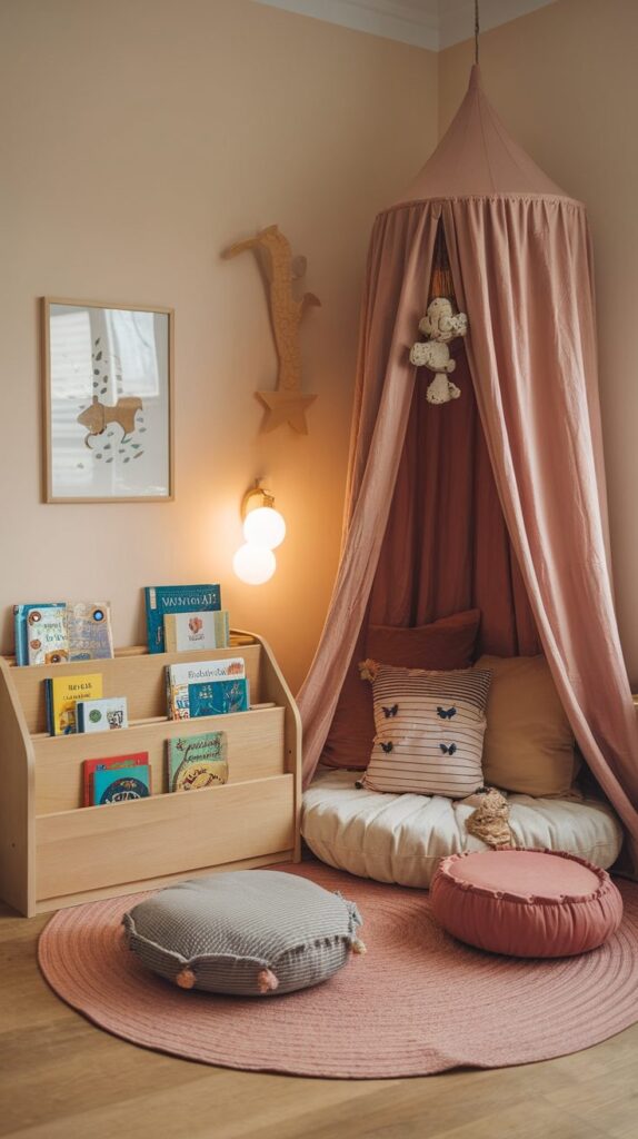 Simple elements like floor cushions, a small bookshelf, and warm lighting can define the nook. A canopy, teepee, or small bench helps separate the reading area from the rest of the room. Having a special place just for books makes children feel valued and independent.
