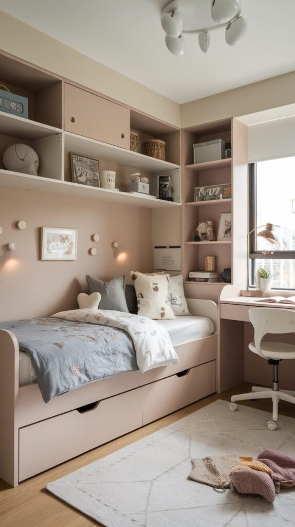 Multi-functional furniture works best in smaller spaces. Beds with built-in drawers, storage benches, and wall-mounted shelves help maximize every inch. Choosing light-colored furniture also makes the room feel bigger and brighter.