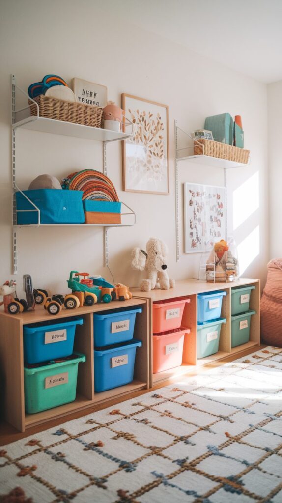 Open bins are practical for younger children since they can see and access their toys. Adding picture labels helps them remember where items belong. This encourages independence.