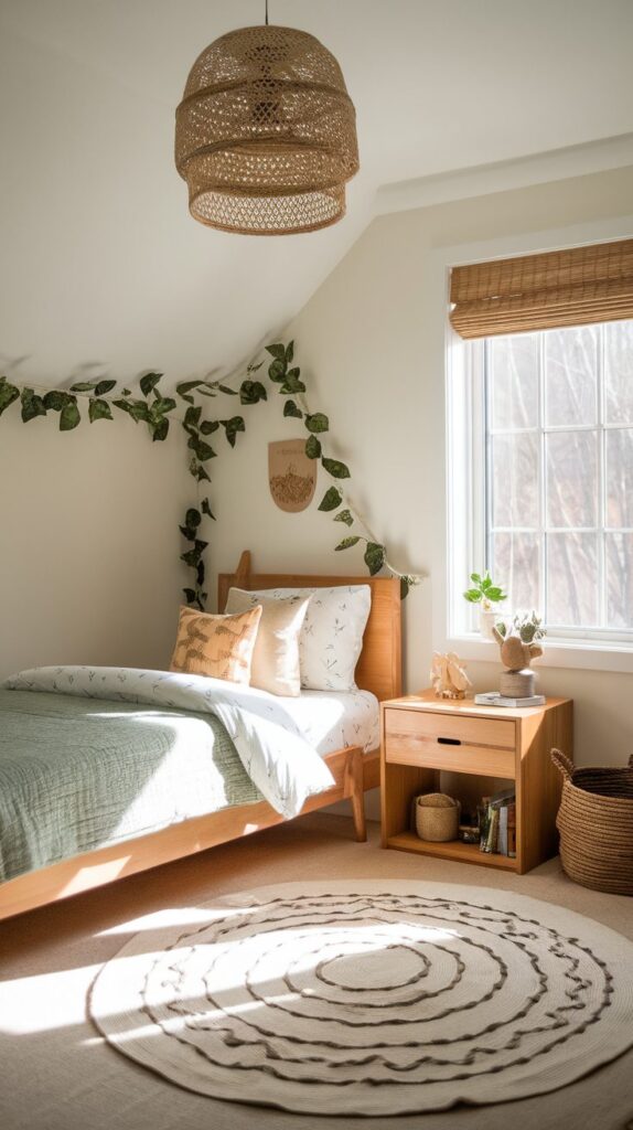 Materials such as woven baskets, cotton fabrics, and light wood tones enhance the natural theme. Green accents through artwork or plants strengthen the connection to nature.