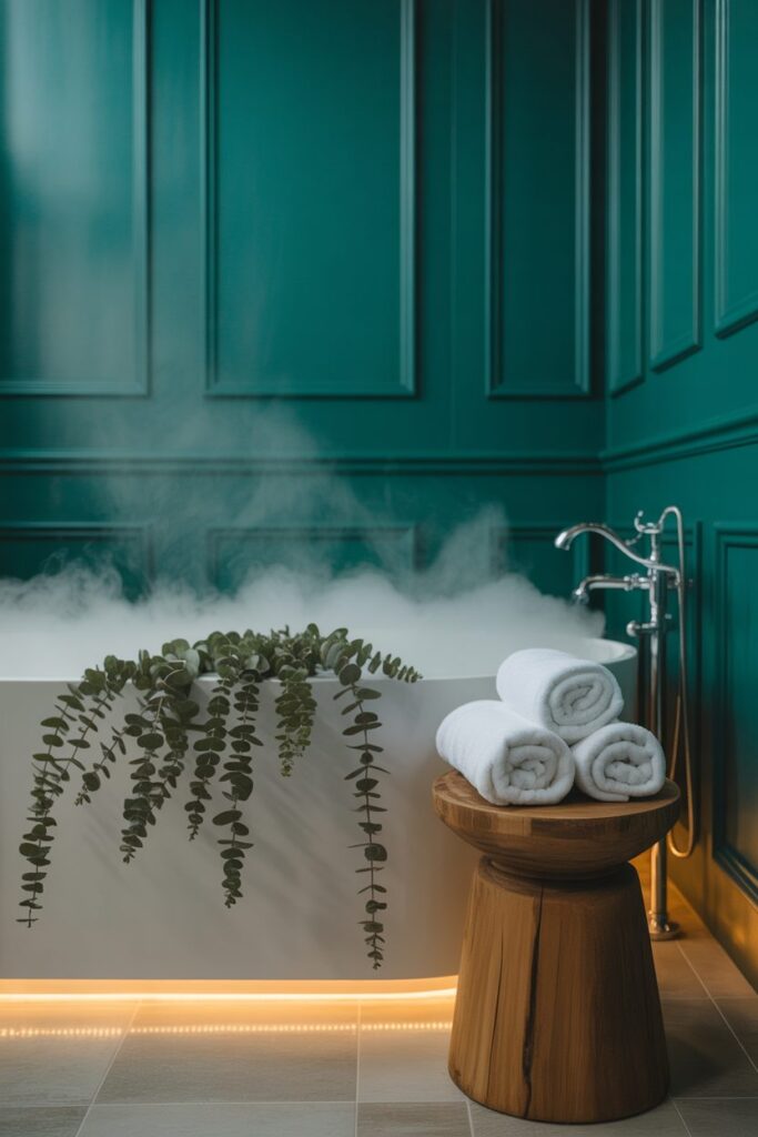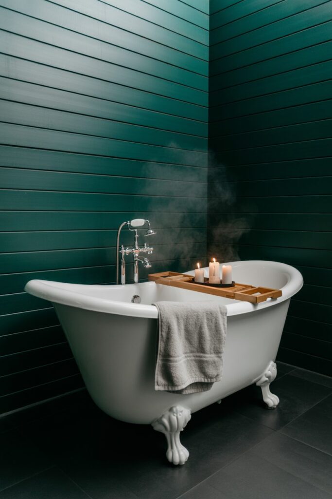 A white freestanding tub against dark green walls creates strong contrast. I love how it becomes the focal point of the room without needing extra decor.