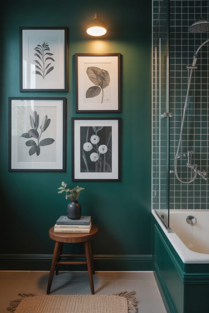 Dark green walls act like a natural backdrop for artwork. I noticed even simple frames looked more premium against it.