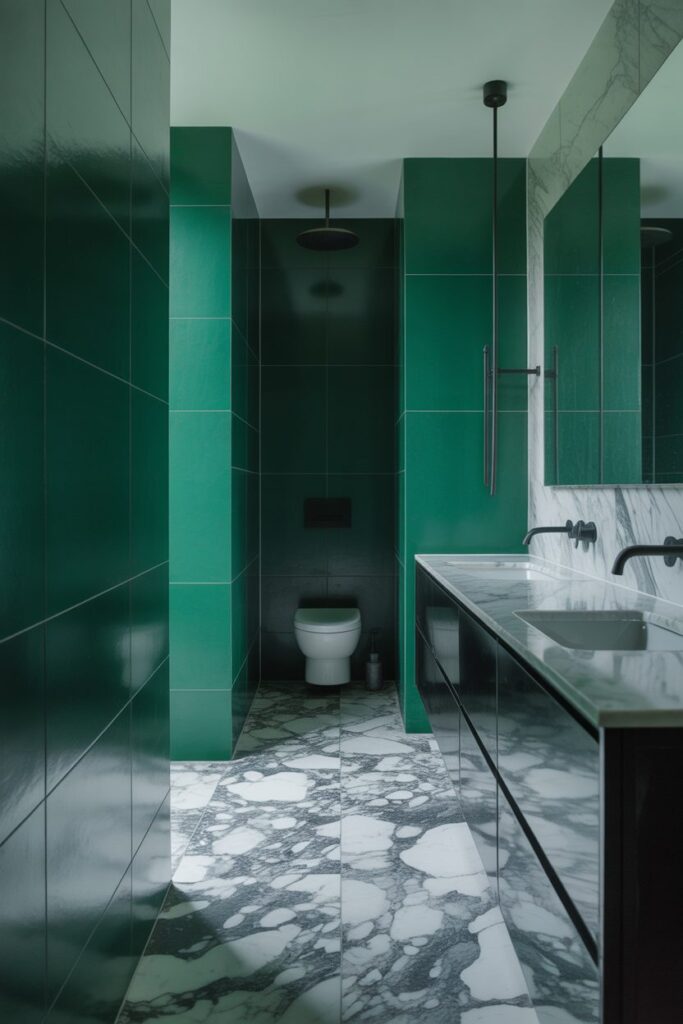 The contrast between deep green and light marble creates a balanced look that feels both bold and elegant.