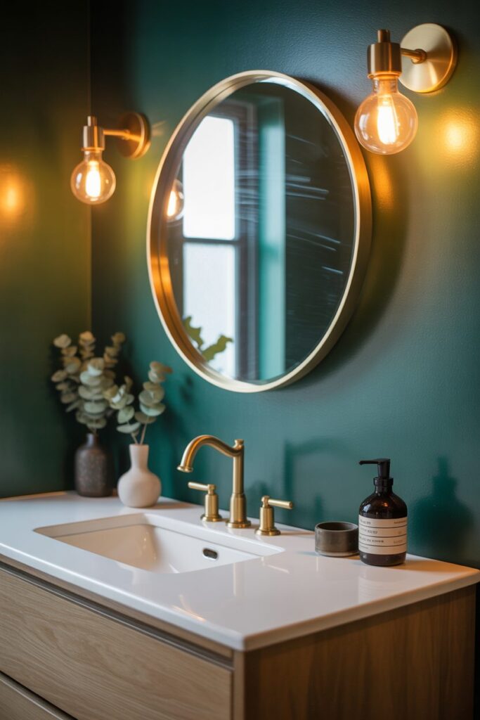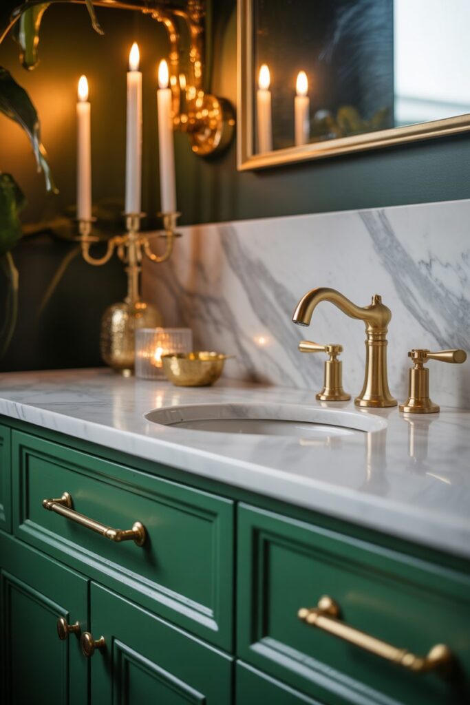 One thing I learned quickly—dark green and gold is a powerful combo. Swapping chrome fixtures for brass instantly made the space feel warmer and more luxurious.