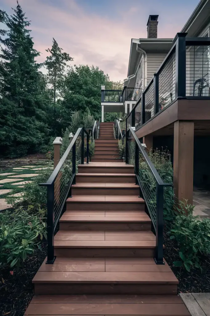 I suggest adding strong railings for extra support, especially for families, and using composite materials for durability. This style fits almost any home and stays timeless over the years.