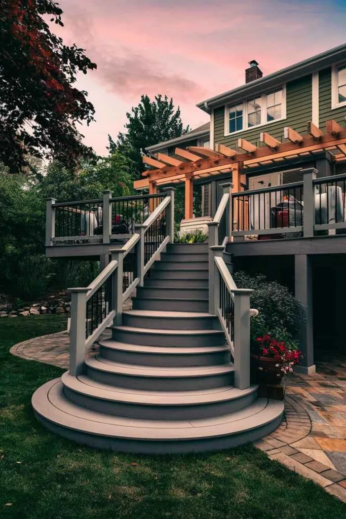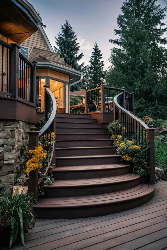 I like curved steps because they create a softer and more natural flow between the deck and the yard. This design blends well with outdoor surroundings.