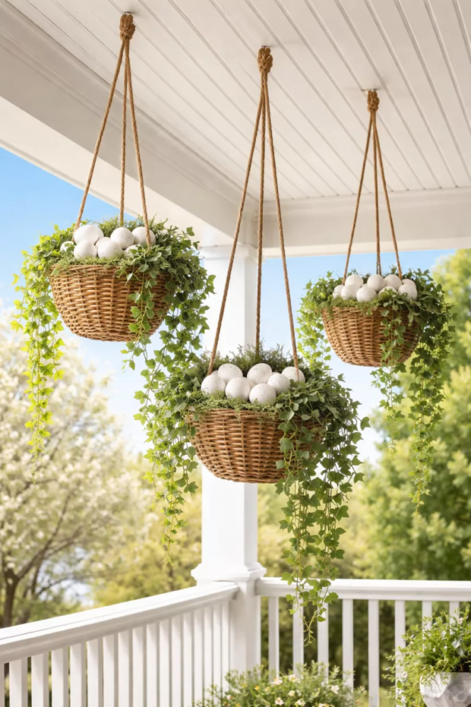 Small wicker baskets filled with decorative eggs can be hung from the porch ceiling with twine. The baskets can hang at different heights for a layered look.