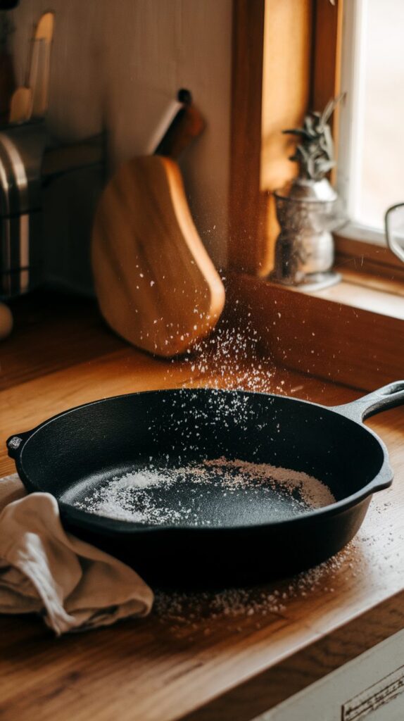 Coarse salt helps clean cast iron pans without damaging their seasoning. Scrubbing gently with salt and a small amount of warm water removes stuck food effectively. Rinsing quickly preserves the pan’s surface. This method avoids soap that could strip seasoning. Proper care keeps cookware in good condition for years. Maintaining kitchen tools properly supports better cooking results.
