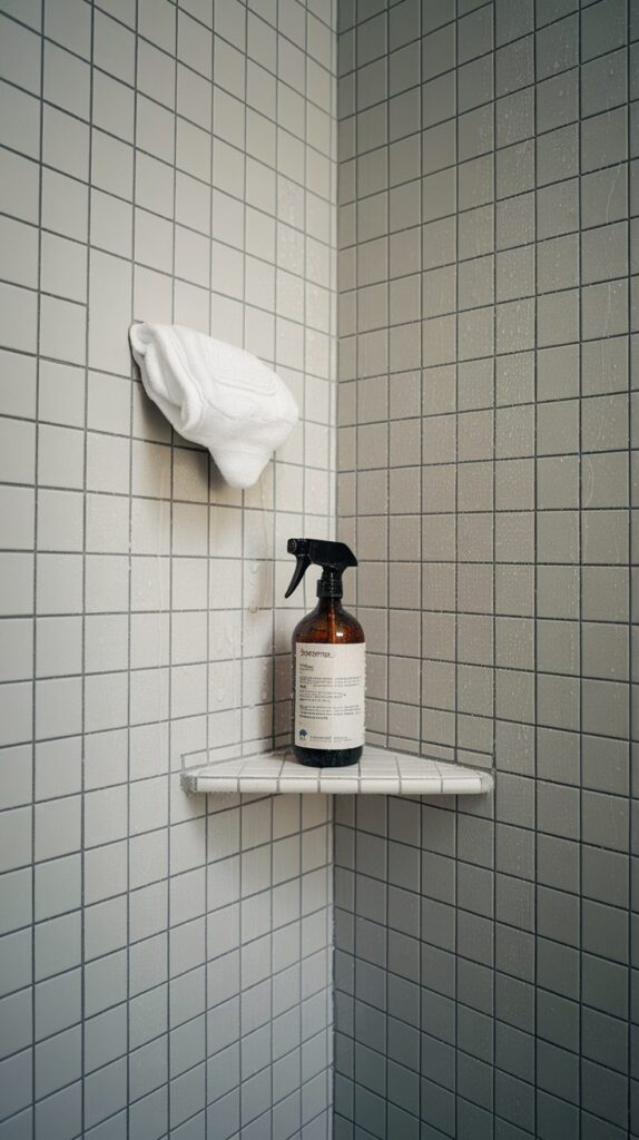 Keeping a vinegar and water spray in the shower makes maintenance easier. Spraying walls after each shower prevents soap scum from building up. This quick habit reduces the need for deep scrubbing later. A few seconds of effort saves significant cleaning time in the future. Preventive care keeps bathrooms looking fresh consistently.