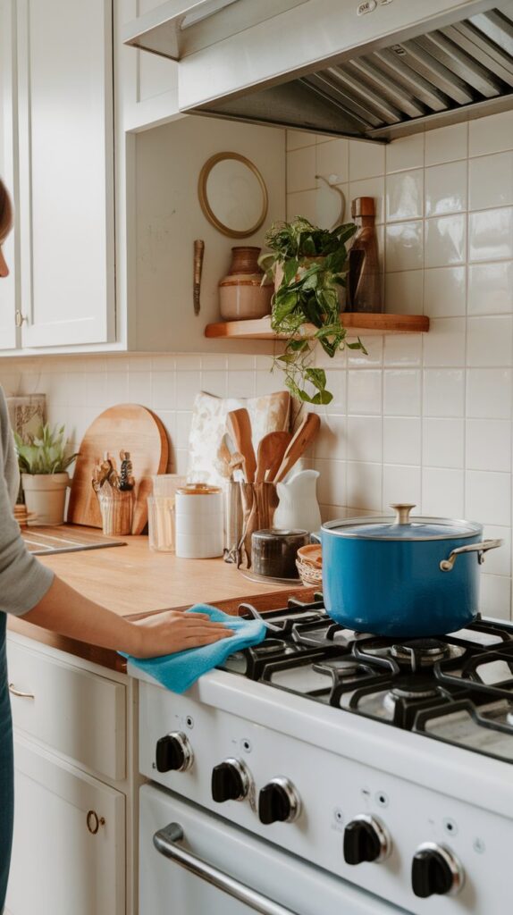 Tidying up during cooking prevents the kitchen from becoming overwhelming. Wiping counters, rinsing tools, and loading dishes while food cooks keeps mess under control. This approach spreads cleaning throughout the process instead of leaving it all for later. The kitchen feels manageable after meals. Small actions during cooking reduce stress at the end of the day.