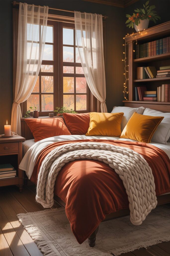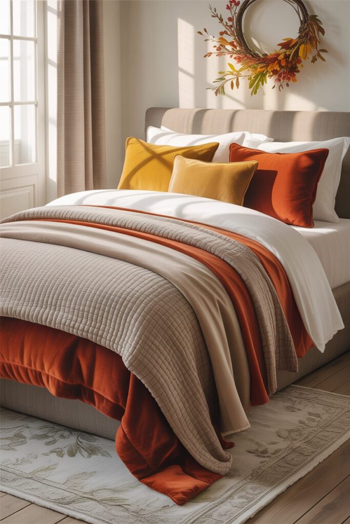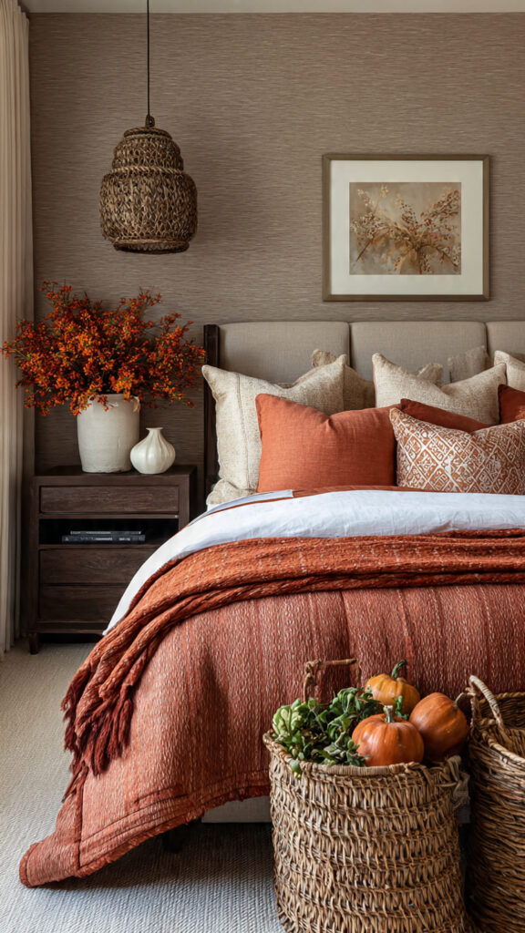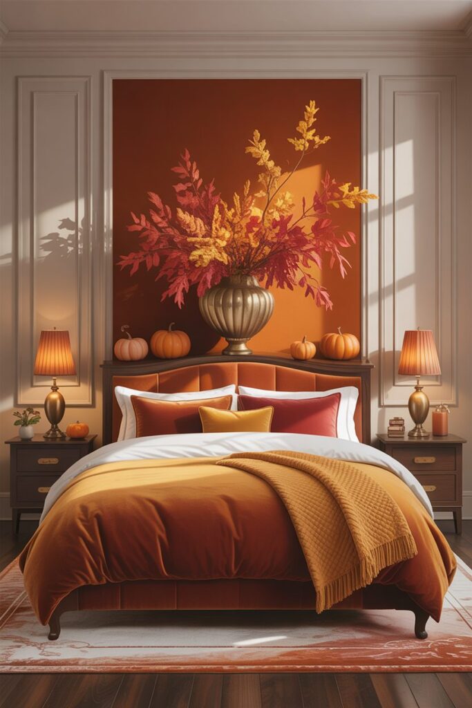 Larger spaces allow for more dramatic Fall Bedroom Decor Ideas. A feature wall painted in a rich autumn shade can instantly anchor the room and create visual depth. High-quality seasonal bedding, such as velvet duvets or thicker layered linens, enhances both style and comfort. Statement decor pieces, including large vases filled with seasonal branches or oversized pumpkins, can fill empty corners beautifully. In a master bedroom, the goal is to create a restful retreat that fully embraces the warmth and richness of fall while maintaining a balanced and elegant look.