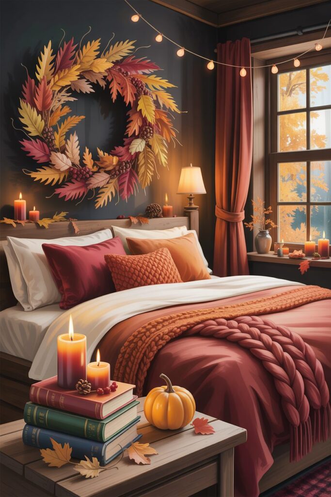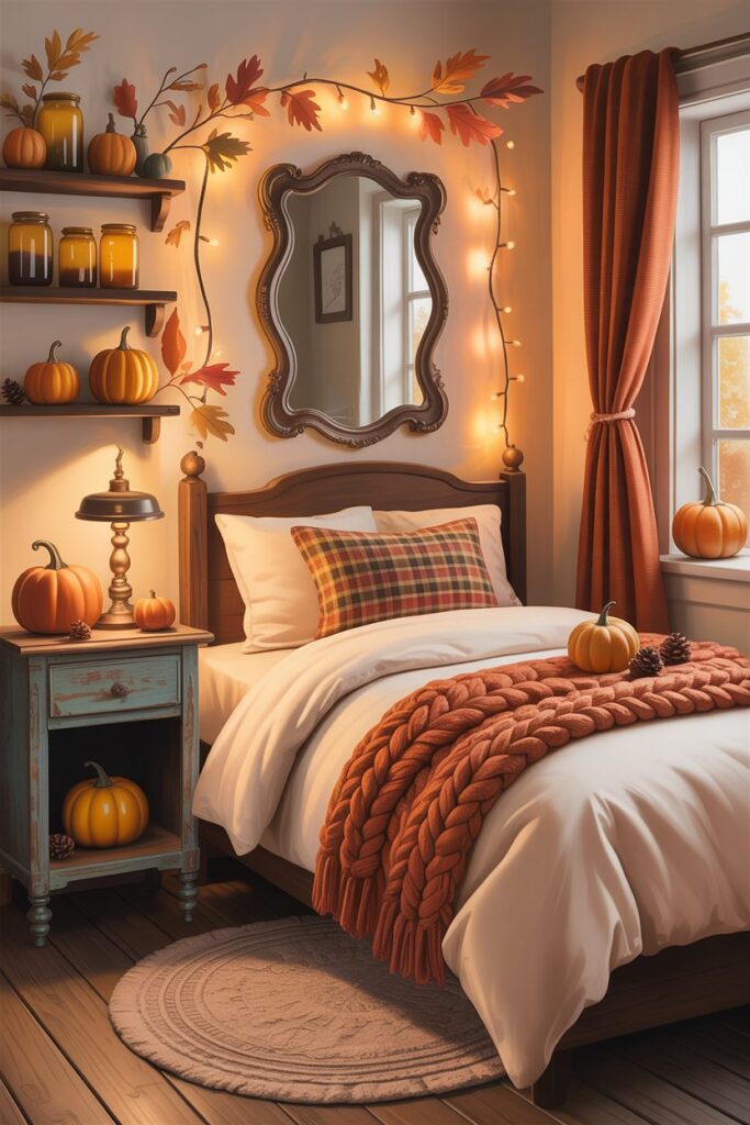 In smaller bedrooms, keeping Fall Bedroom Decor Ideas simple and intentional works best. Using vertical wall space for decor, such as hanging seasonal wreaths or textiles, adds interest without taking up floor space. Limiting decorations to a few impactful pieces—like a cozy throw, a couple of pumpkins, or warm lighting—prevents the room from feeling crowded. Mirrors can help reflect soft light and make the space appear more open while still maintaining the cozy autumn mood. With careful choices, even a compact bedroom can feel warm, seasonal, and comfortable.