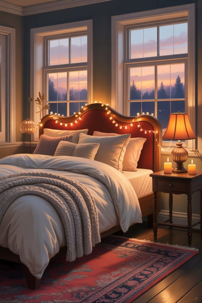 Lighting becomes especially important during autumn when daylight hours shorten. Soft, warm lighting is essential for achieving the inviting look that defines Fall Bedroom Decor Ideas. String lights placed along a headboard or window frame can introduce a gentle glow that feels relaxing in the evening. Table lamps with warm-toned shades help create a calm atmosphere while reducing harsh brightness. Candles provide a flickering effect that adds both warmth and softness to the room. When lighting is layered properly, the bedroom feels peaceful and balanced, making it easier to unwind and enjoy quiet fall nights.